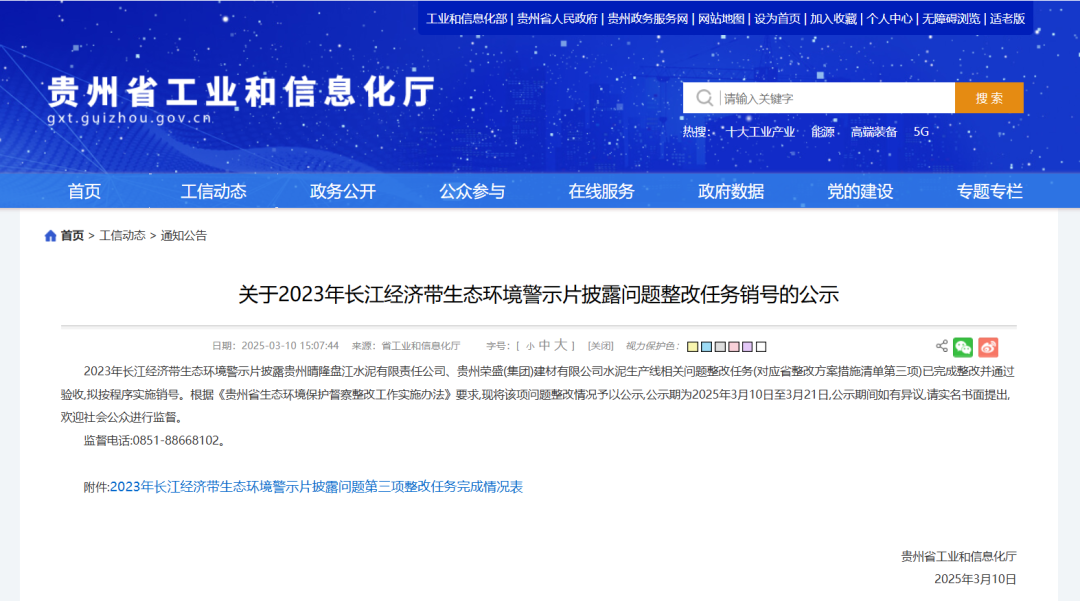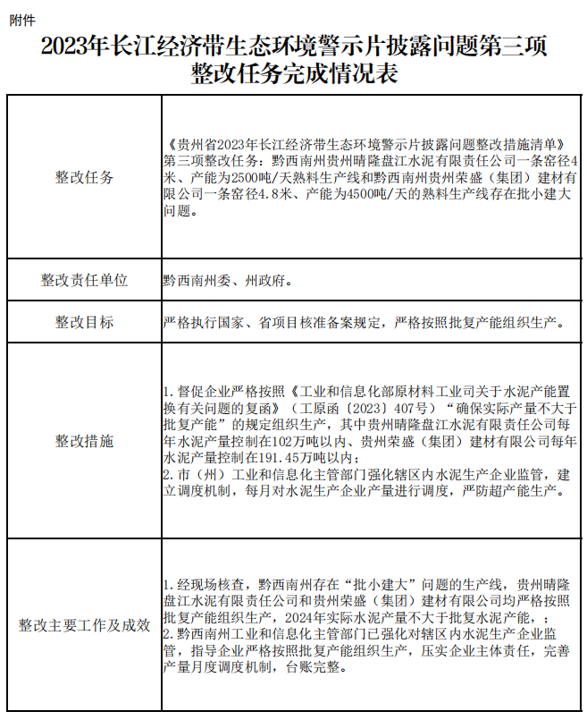 3月10日,貴州省工業(yè)和信息化廳發(fā)布關(guān)于2023年長江經(jīng)濟(jì)帶生態(tài)環(huán)境警示片披露問題整改任務(wù)銷號的公示稱,《貴州省2023年長江經(jīng)濟(jì)帶生態(tài)環(huán)境警示片披露問題整改措施清單》第三項整改任務(wù):黔西南州貴州晴隆盤江水泥有限責(zé)任公司一條窯徑4米、產(chǎn)能為2500噸/天熟料生產(chǎn)線和黔西南州貴州榮盛(集團(tuán))建材有限公司一條窯徑4.8米、產(chǎn)能為4500噸/天的熟料生產(chǎn)線存在批小建大問題。