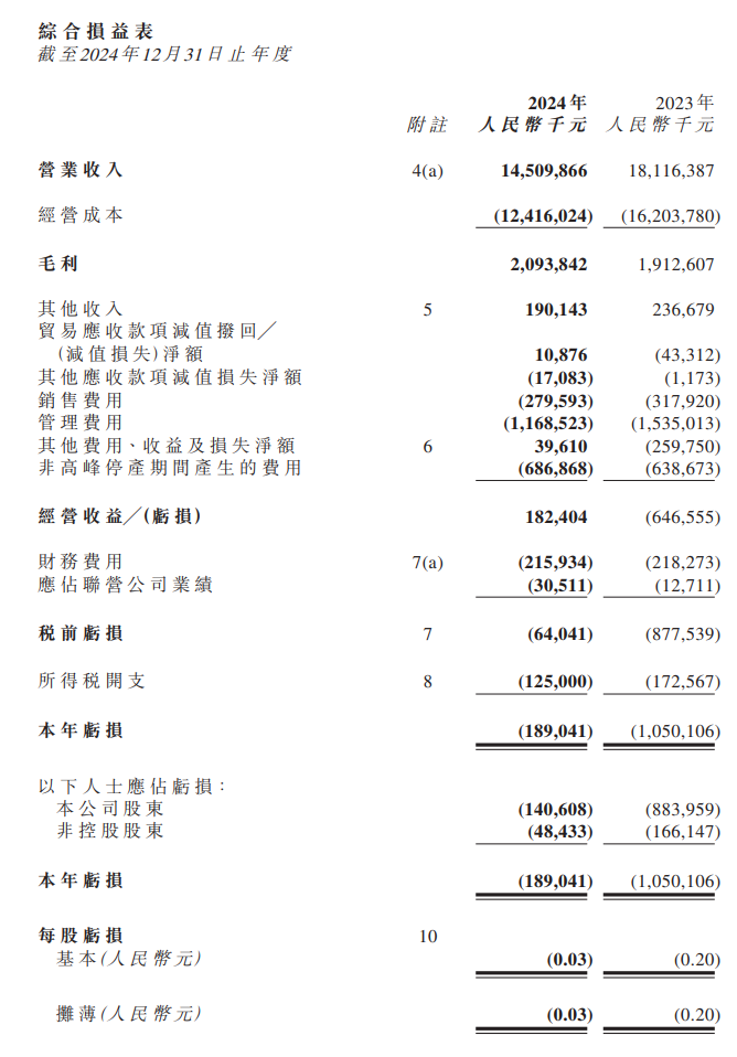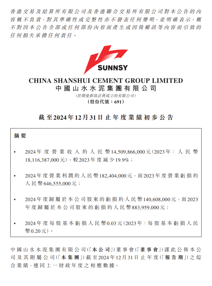 日前,山水水泥公布2024年業(yè)績,營業(yè)收入約人民幣145.1億元,較2023年度減少19.9%;歸屬于公司股東的虧損約人民幣1.41億元,同比收窄84.09%;每股基本虧損人民幣0.03元。 報告期內(nèi),該集團銷售水泥、熟料合計5178.3萬噸,同比減少17.7%;銷售商品混凝土227.2萬立方米,同比減少25.5%。收益減少主要由于本年度水泥銷量同比減少15%及價格同比下降3%所致。 本年度虧損主要由于水泥受市場需求疲弱,銷量下降所致。惟因本年度各項成本及費用控制措施下,營業(yè)毛利上升,銷售、管理及財務(wù)費用皆有不同程度的降幅,因而全年虧損同比收窄。