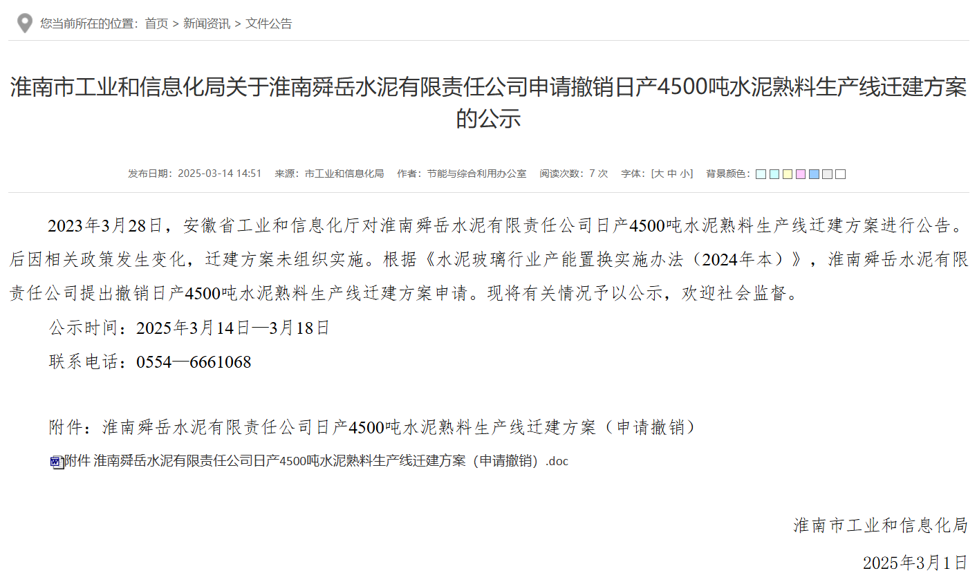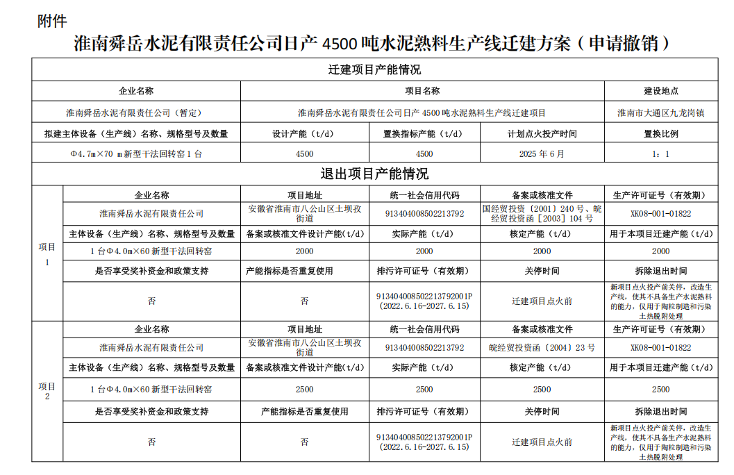 日前,安徽淮南市工業(yè)和信息化局發(fā)布《關(guān)于淮南舜岳水泥有限責(zé)任公司申請(qǐng)撤銷日產(chǎn)4500噸水泥熟料生產(chǎn)線遷建方案的公示》稱,2023年3月28日,安徽省工業(yè)和信息化廳對(duì)淮南舜岳水泥有限責(zé)任公司日產(chǎn)4500噸水泥熟料生產(chǎn)線遷建方案進(jìn)行公告。后因相關(guān)政策發(fā)生變化,遷建方案未組織實(shí)施。根據(jù)《水泥玻璃行業(yè)產(chǎn)能置換實(shí)施辦法(2024年本)》,淮南舜岳水泥有限責(zé)任公司提出撤銷日產(chǎn)4500噸水泥熟料生產(chǎn)線遷建方案申請(qǐng)。現(xiàn)將有關(guān)情況予以公示,歡迎社會(huì)監(jiān)督。公示時(shí)間:2025年3月14日—3月18日聯(lián)系電話:0554—6661068.