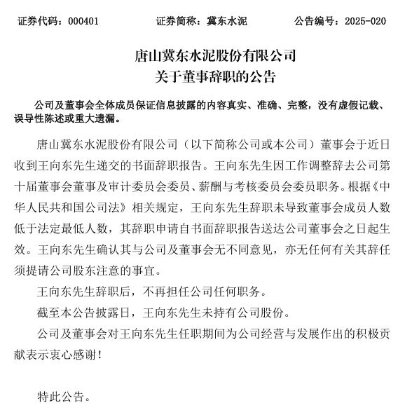 3月24日,冀東水泥發(fā)布公告。王向東先生因工作調(diào)整辭去公司第十屆董事會董事及審計委員會委員、薪酬與考核委員會委員職務(wù),不再擔(dān)任公司任何職務(wù)。