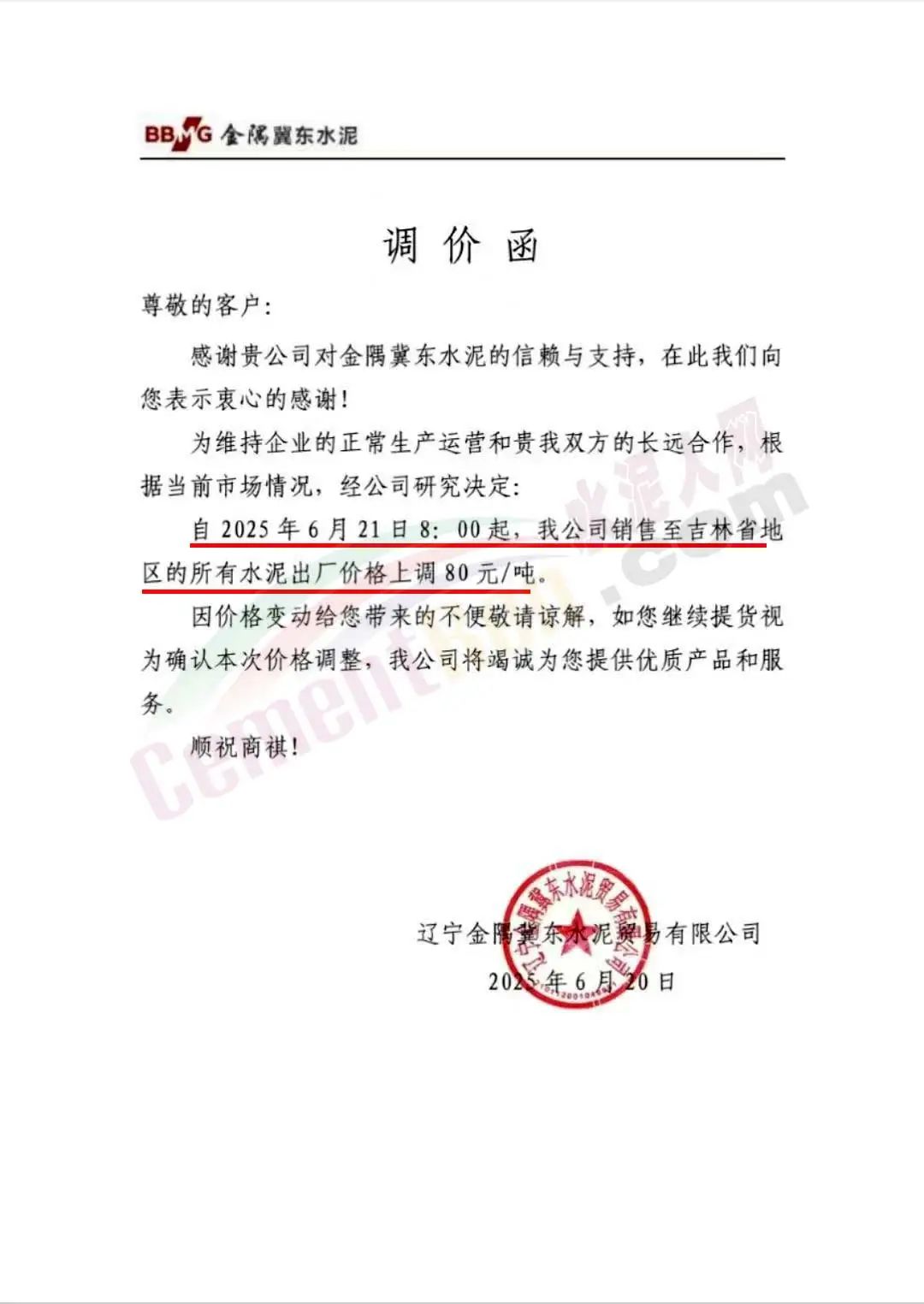 遼寧金隅冀東水泥貿(mào)易有限公司通知稱,為維持企業(yè)的正常生產(chǎn)運營,根據(jù)當(dāng)前市場情況,經(jīng)公司研究決定,自2025年6月21日8時起,公司銷售至吉林省地區(qū)的所有水泥出廠價格上調(diào)80元/噸。
