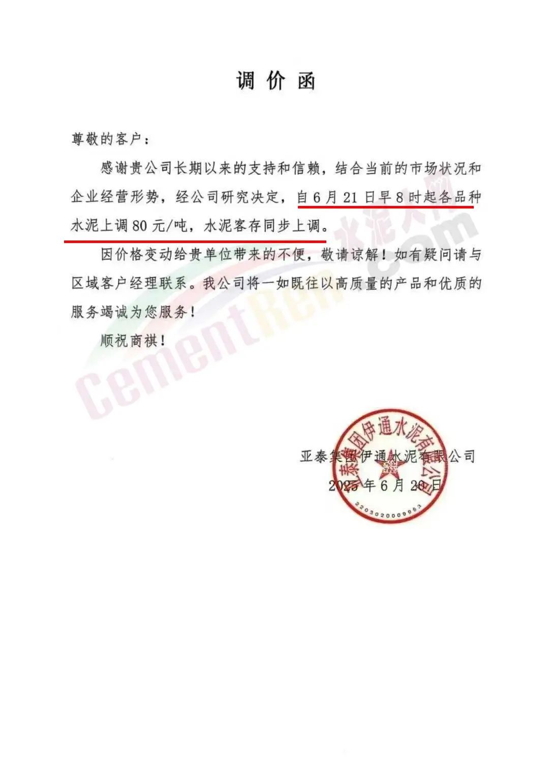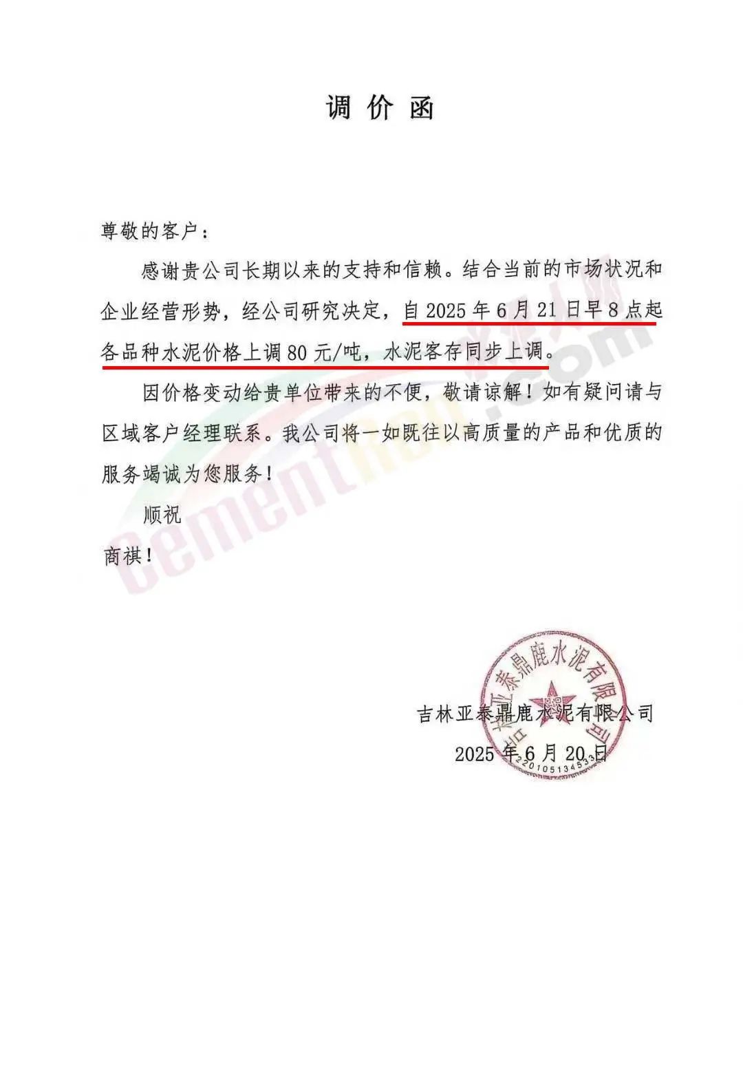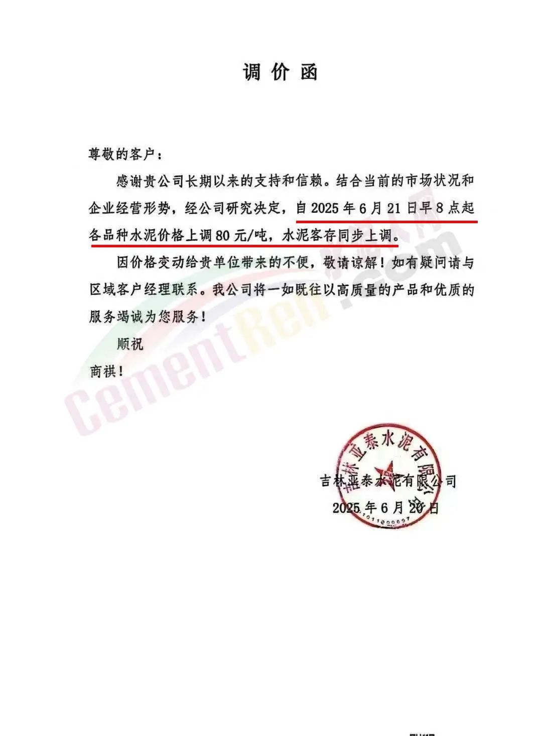 吉林亞泰鼎鹿水泥有限公司通知,結(jié)合當(dāng)前的市場狀況和企業(yè)經(jīng)營形勢,經(jīng)公司研究決定,自2025年6月21日早8點起各品種水泥價格上調(diào)80元/噸,水泥客存同步上調(diào)。