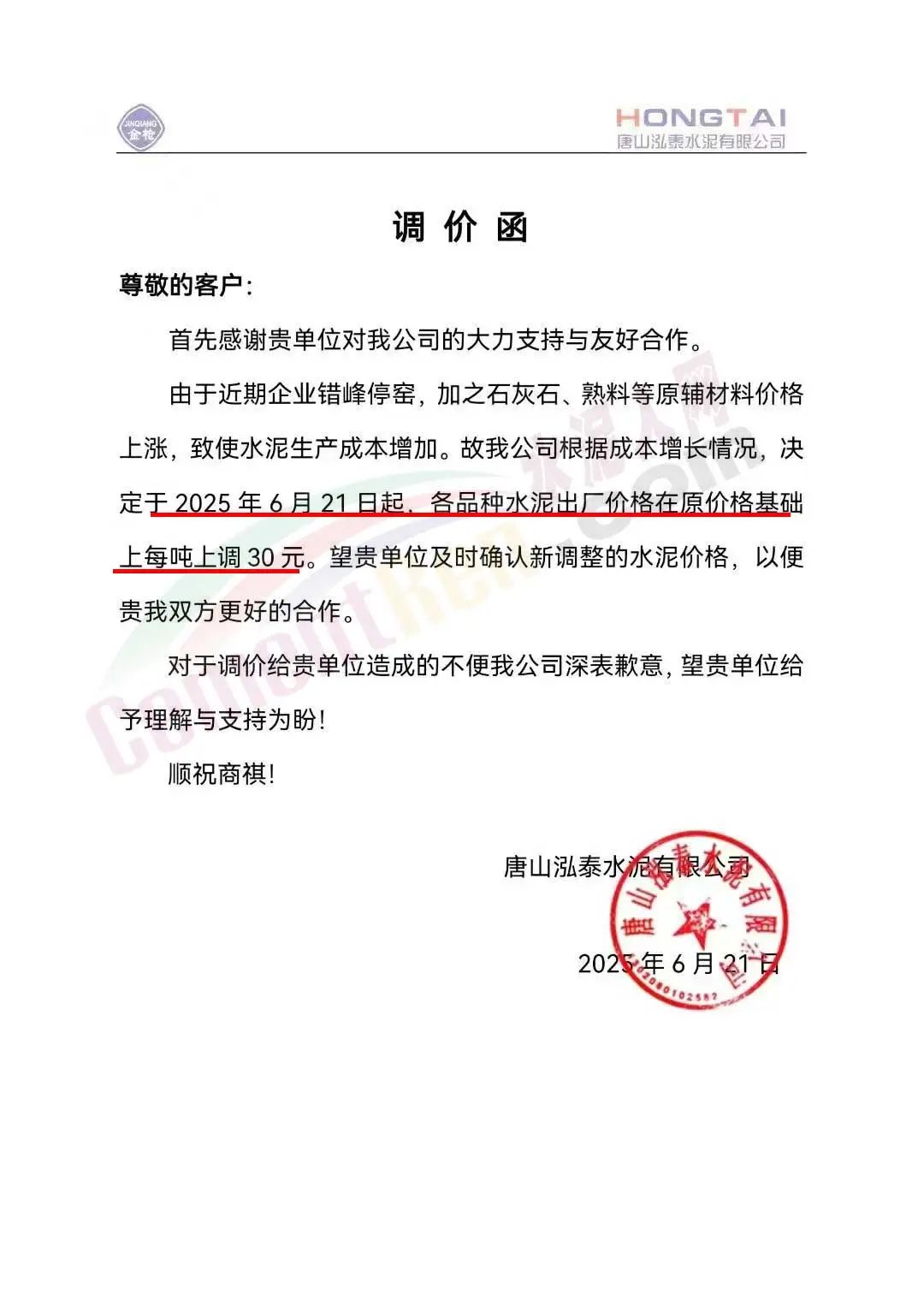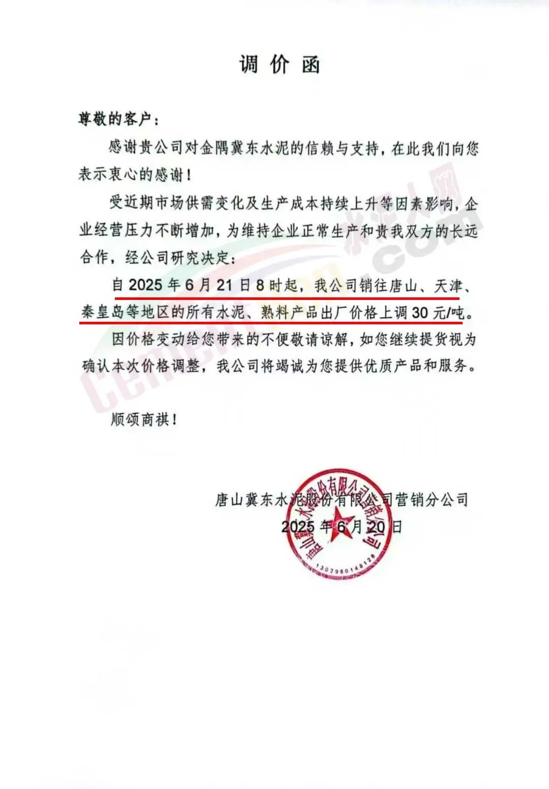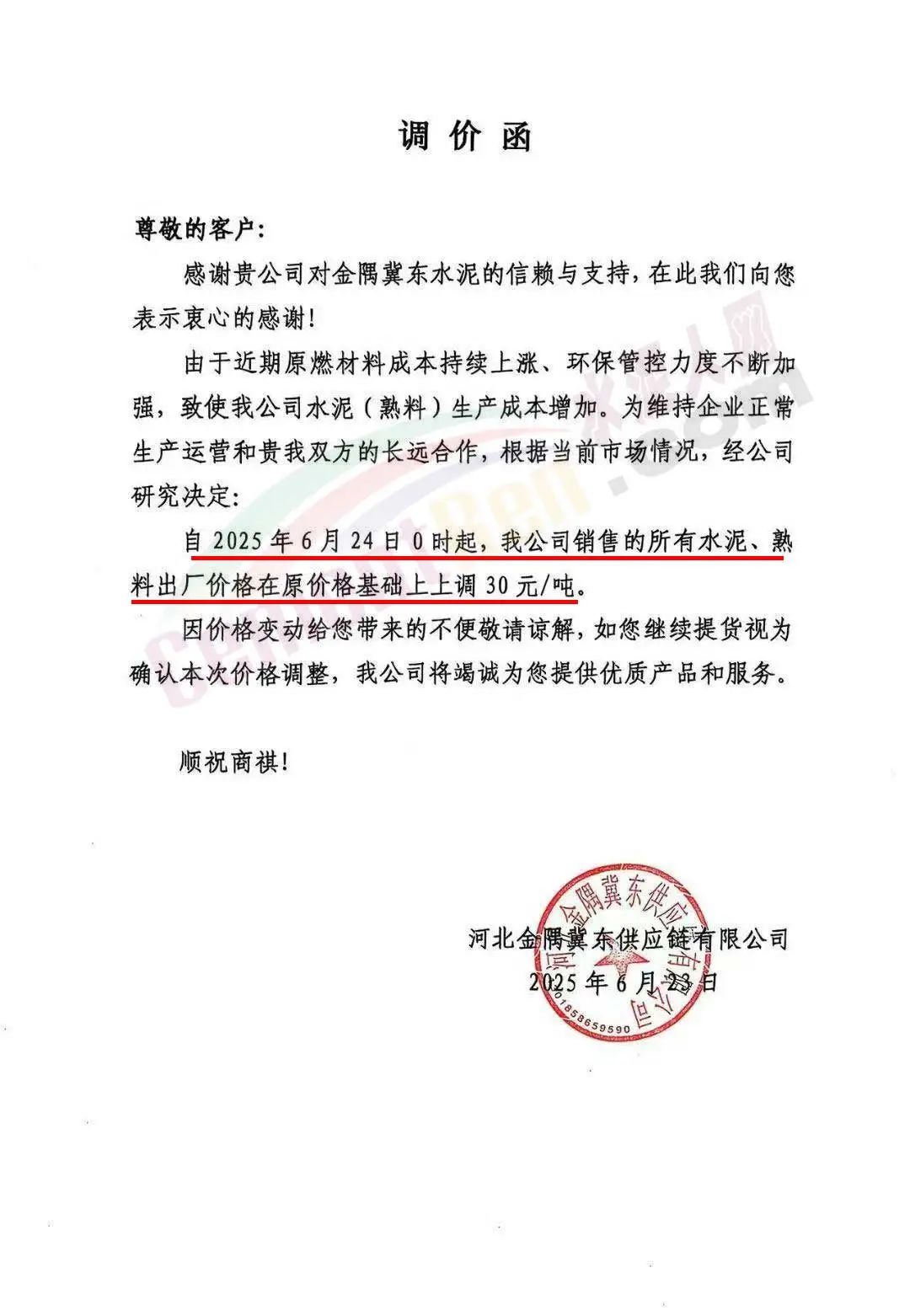 河北金隅冀東供應(yīng)鏈有限公司通知,近期原燃材料成本持續(xù)上漲、環(huán)保管控力度不斷加強,致使我公司水泥(熟料)生產(chǎn)成本增加。為維持企業(yè)正常生產(chǎn)運營和貴我雙方的長遠(yuǎn)合作,根據(jù)當(dāng)前市場情況,經(jīng)公司研究決定:自2025年6月24日0時起,公司銷售的所有水泥、熟料出廠價格在原價格基礎(chǔ)上上調(diào)30元/噸。