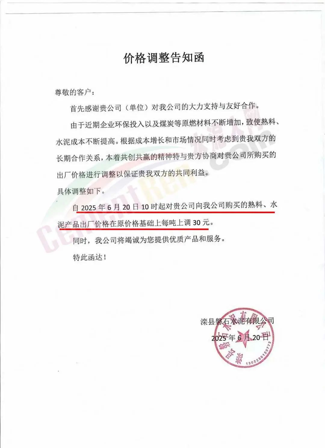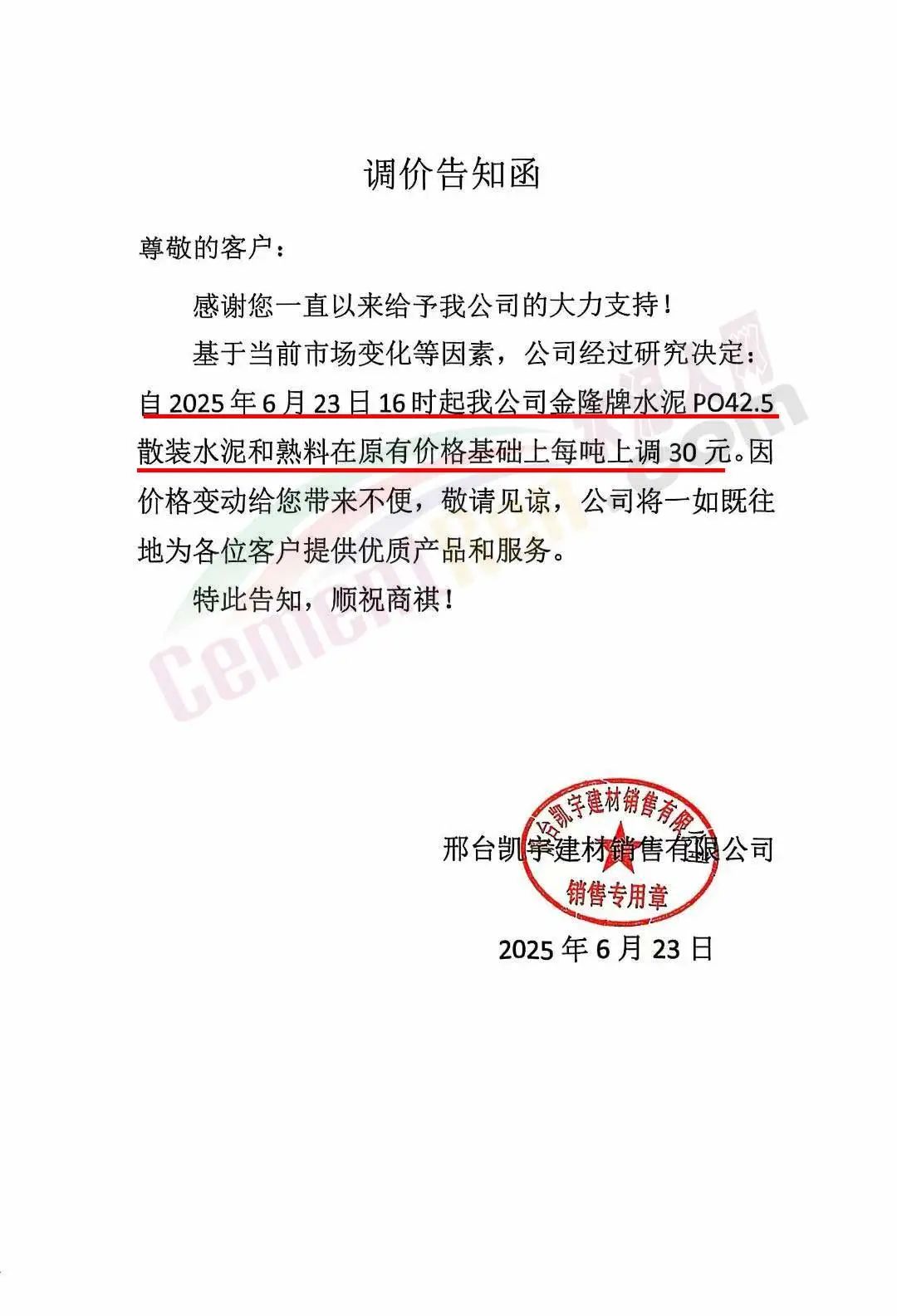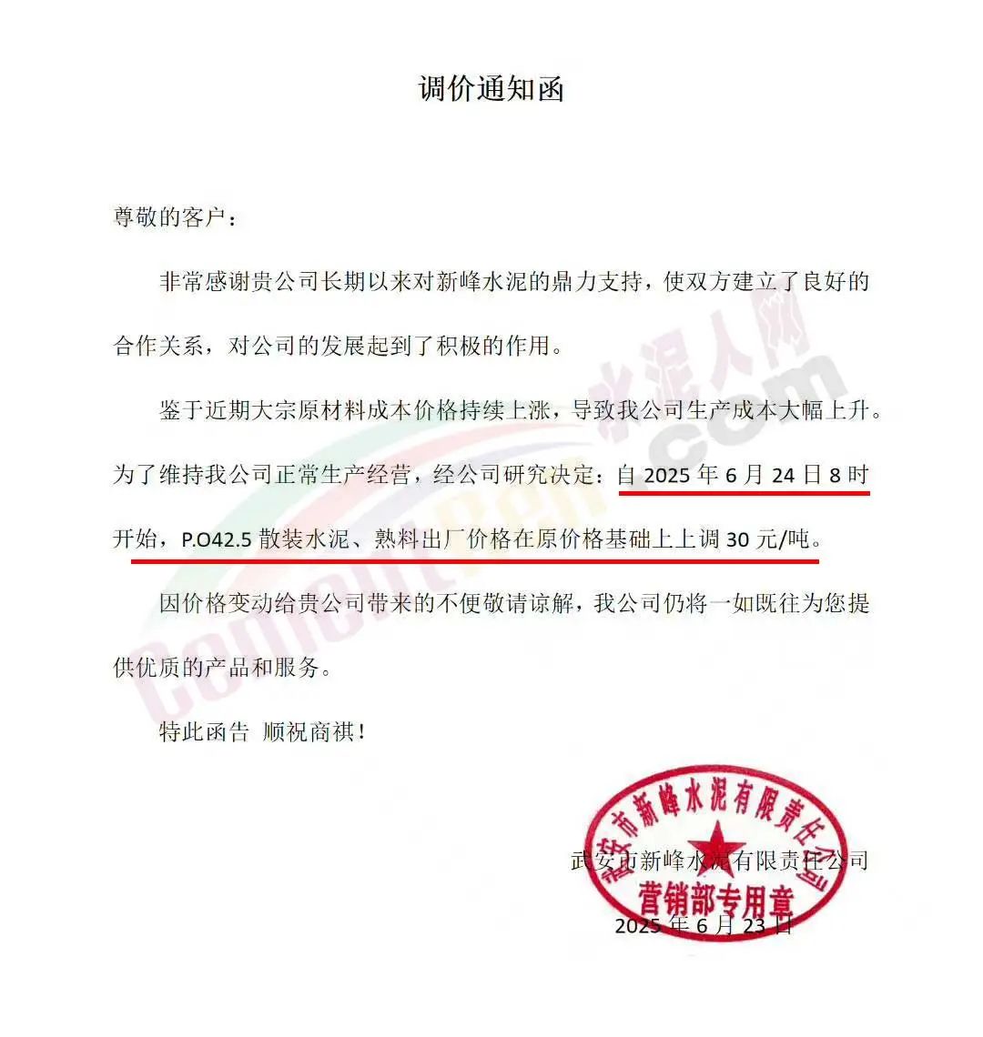 沙河市雙基水泥有限公司通知,經(jīng)公司研究決定自2025年6月24日上午8時起,P042.5散裝水泥及熟料出廠價格上調(diào)30元/噸。