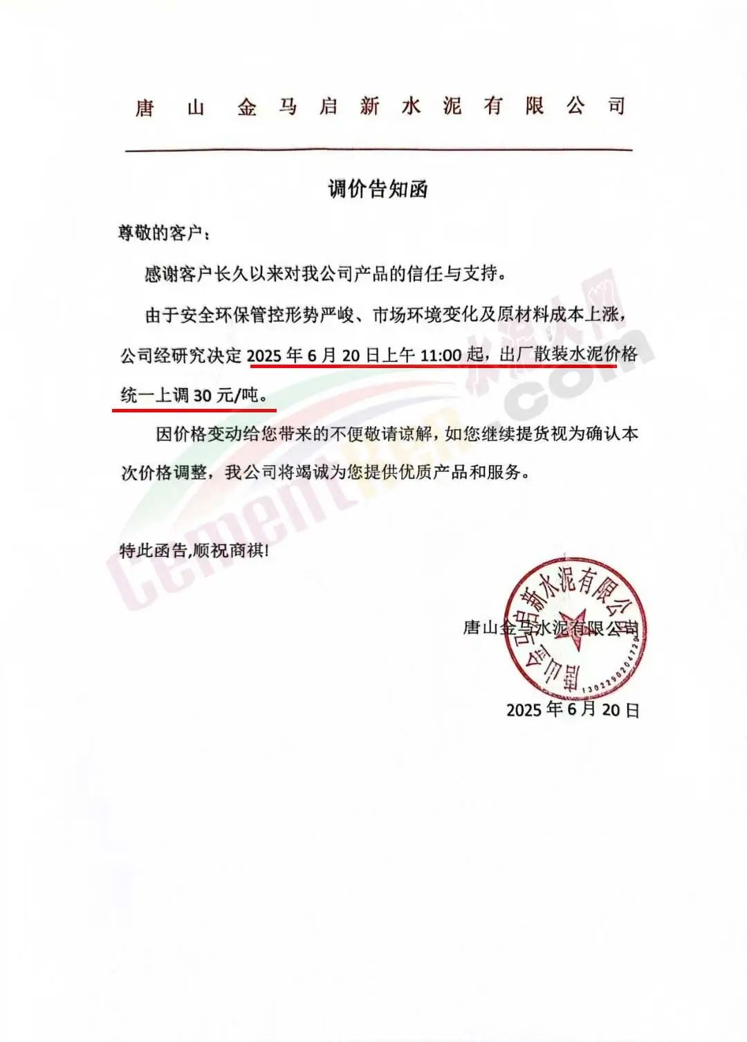 唐山金馬水泥有限公司通知,由于安全環(huán)保管控形勢嚴(yán)峻、市場環(huán)境變化及原材料成本上漲:公司經(jīng)研究決定2025年6月20日上午11:00起,出廠散裝水泥價格統(tǒng)一上調(diào)30元/噸。