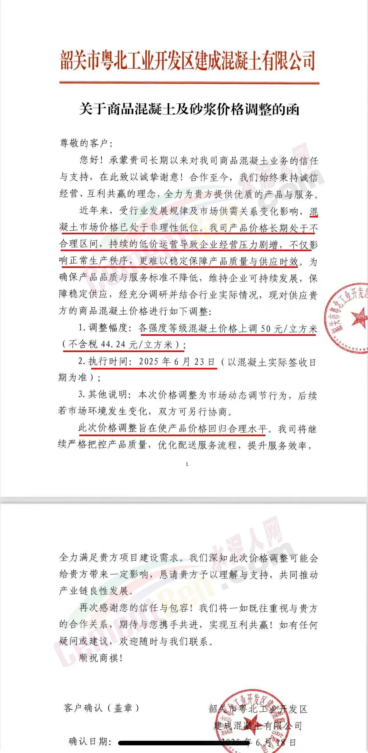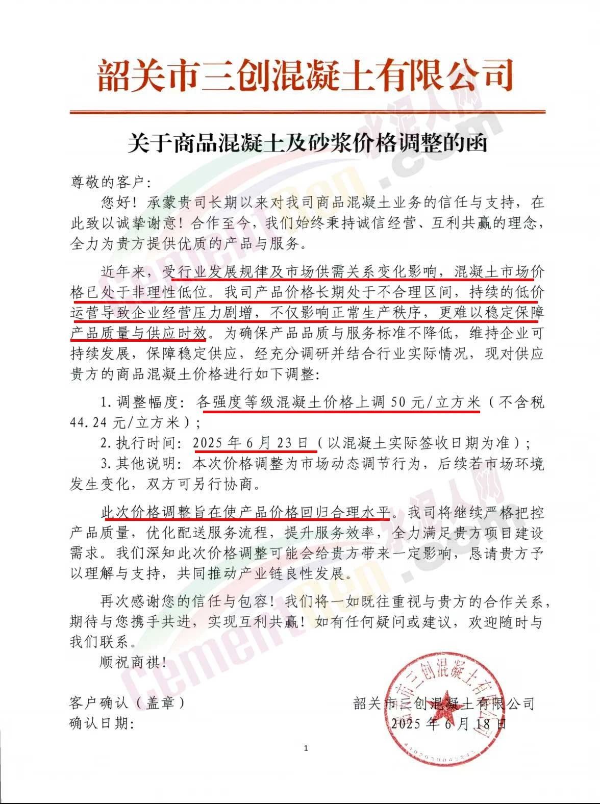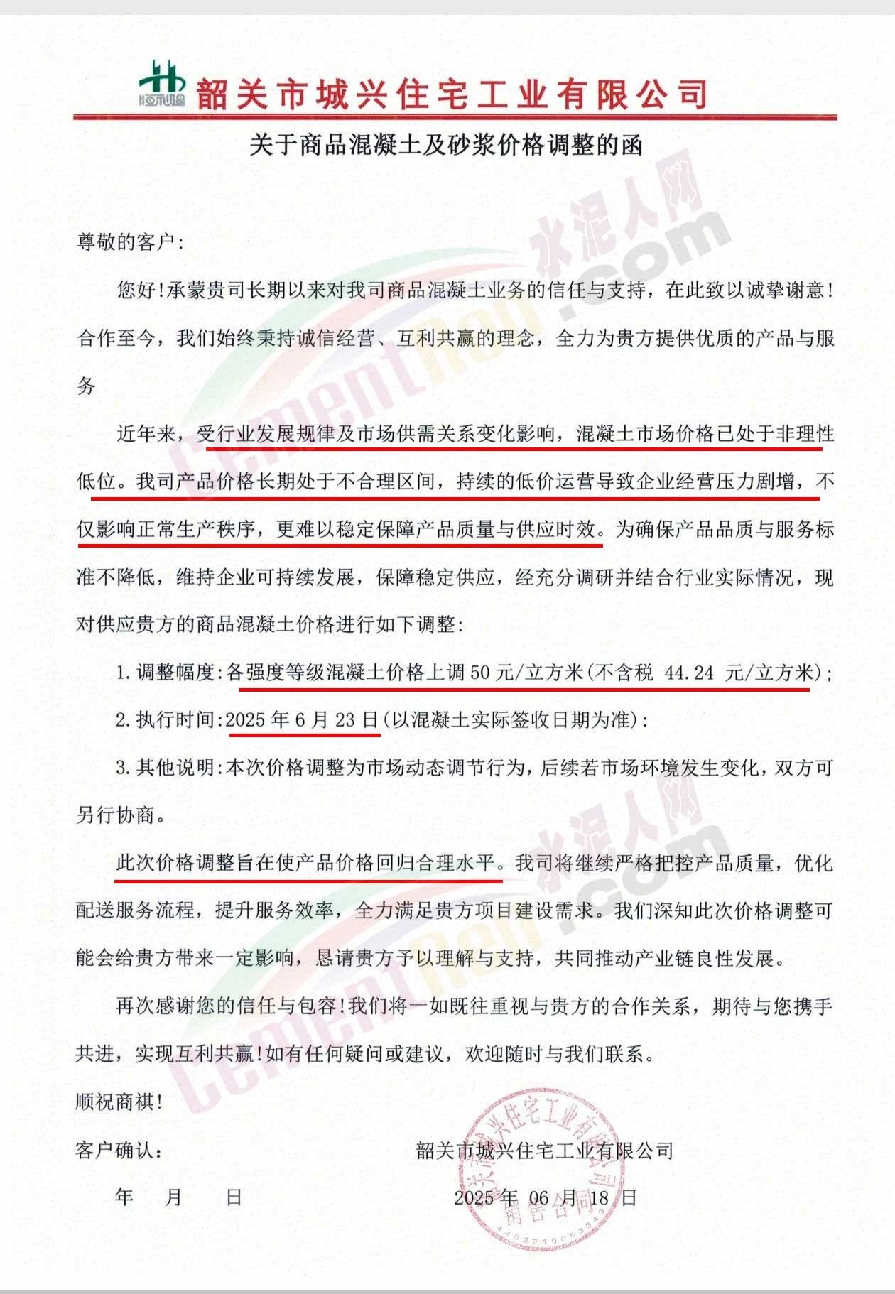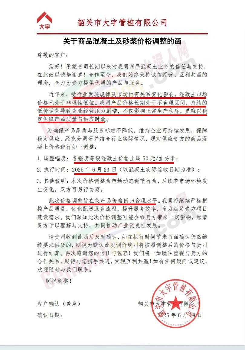 近日,乳源瑤族自治縣宏建商品混凝土有限公司、韶關(guān)市城興住宅工業(yè)有限公司、韶關(guān)市三創(chuàng)混凝土有限公司等近10家商品混凝土企業(yè)聯(lián)合發(fā)布調(diào)價(jià)函,宣布自2025年6月23日起,各強(qiáng)度等級混凝土價(jià)格統(tǒng)一上調(diào)50元/立方米。這一舉措不僅引發(fā)了行業(yè)震動(dòng),更被視為混凝土企業(yè)在長期低價(jià)競爭后的一次“絕地反擊”。