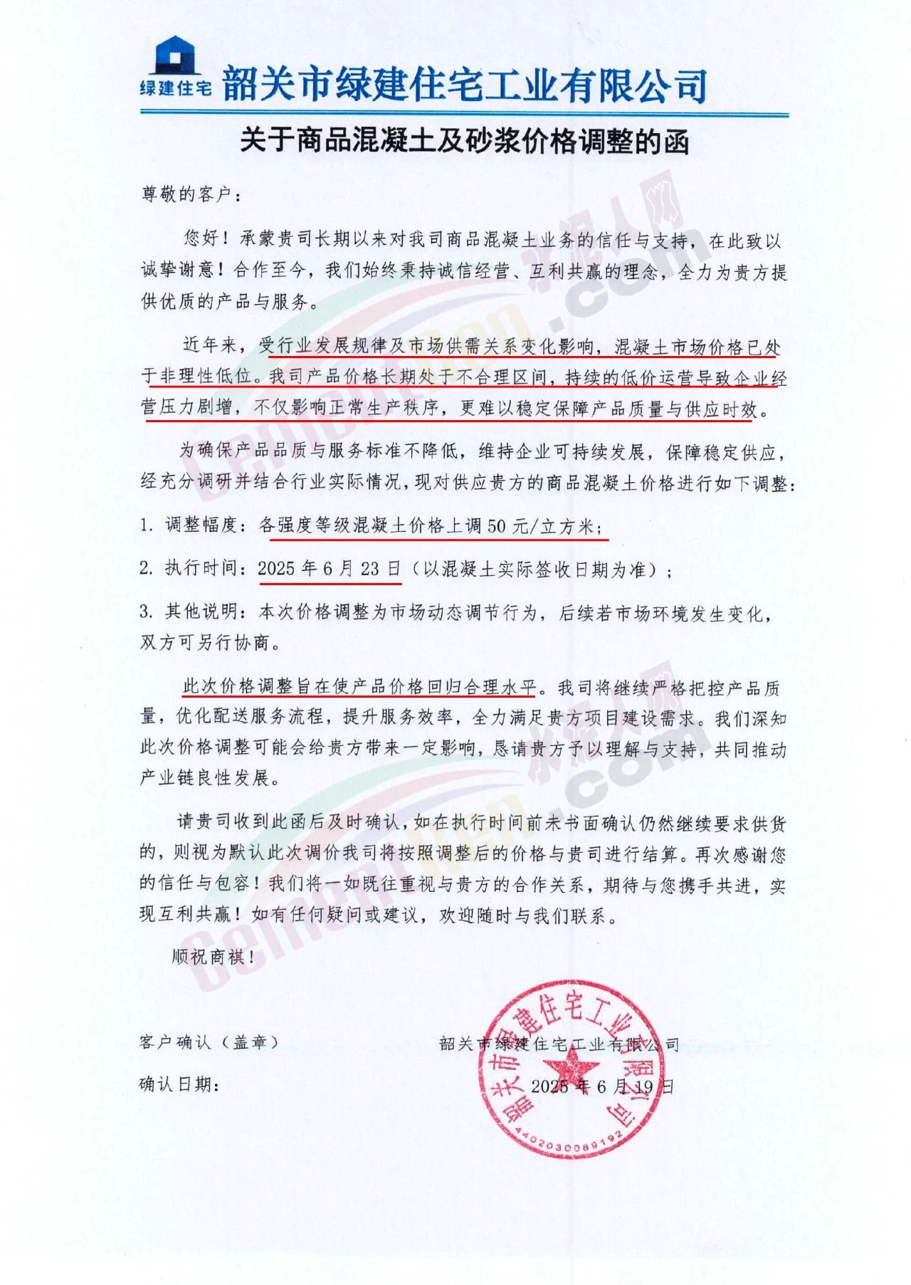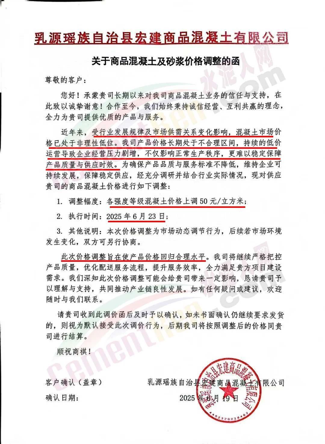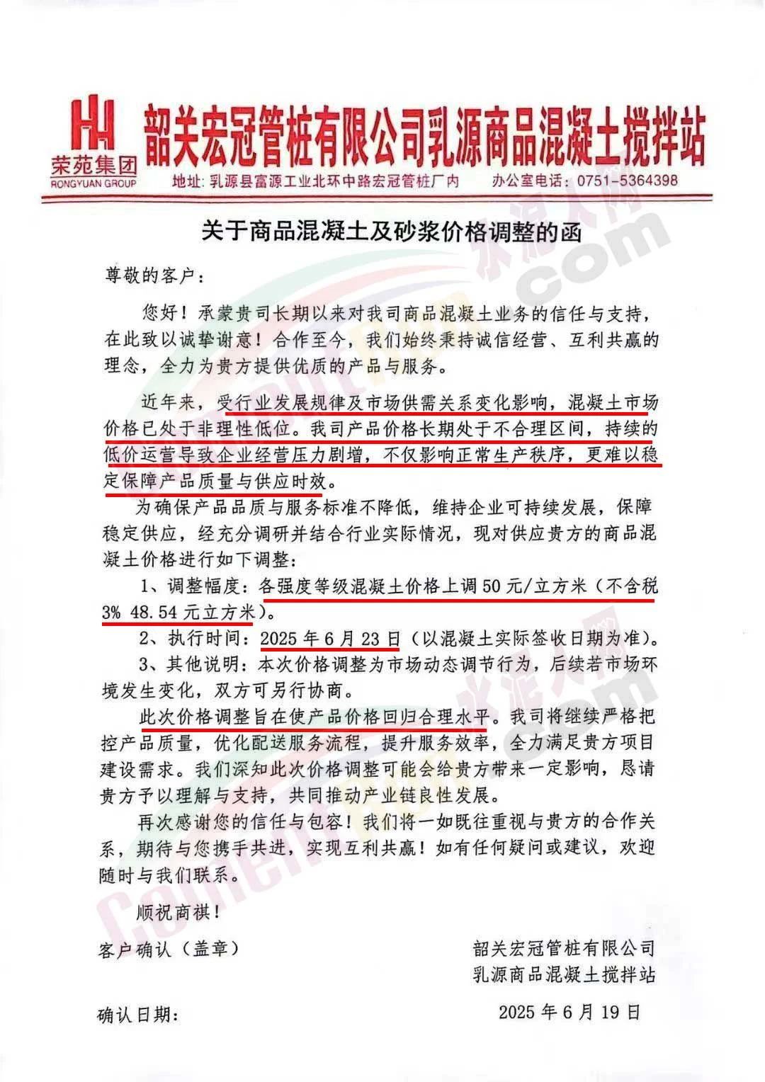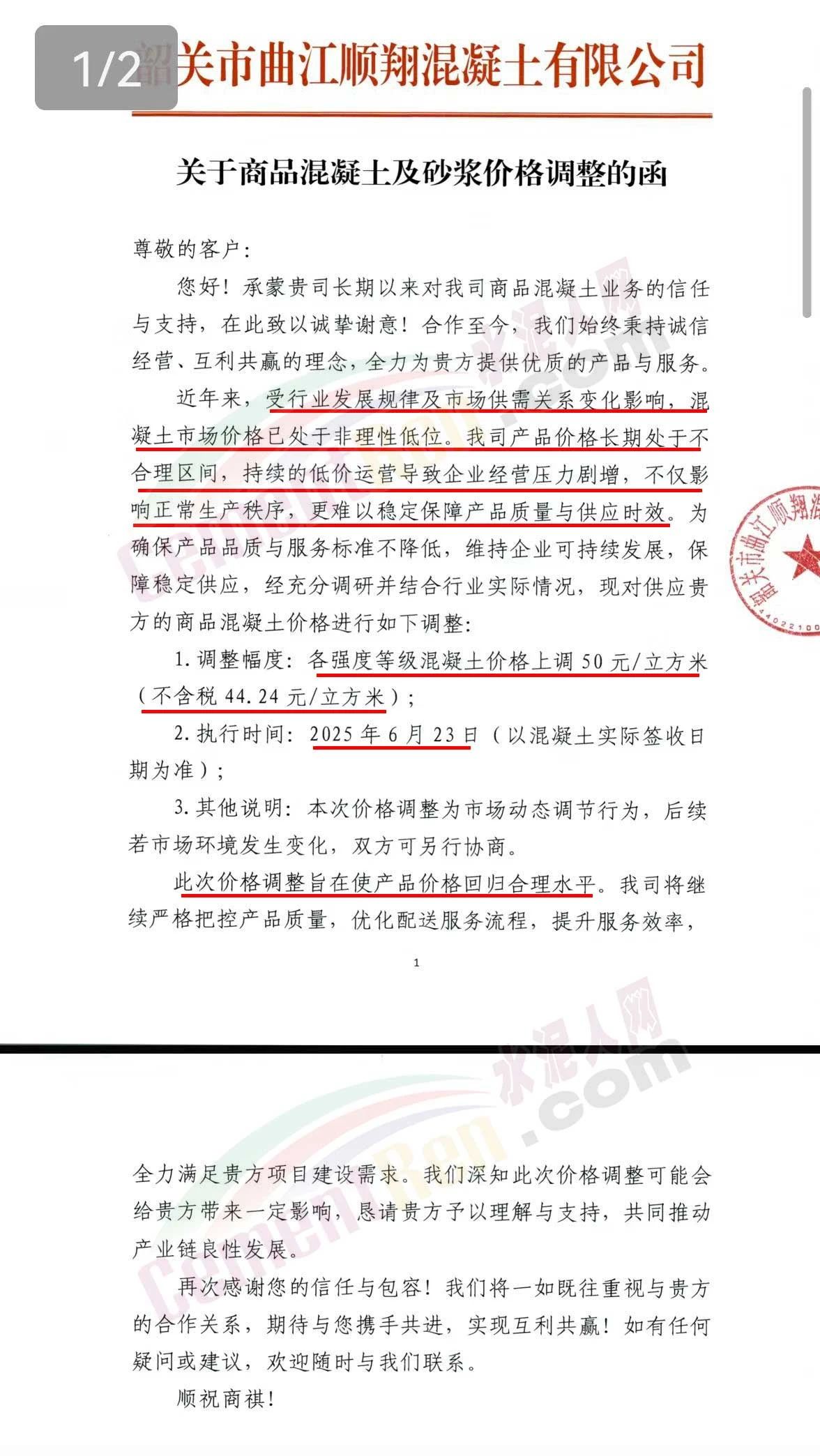 近日,乳源瑤族自治縣宏建商品混凝土有限公司、韶關(guān)市城興住宅工業(yè)有限公司、韶關(guān)市三創(chuàng)混凝土有限公司等近10家商品混凝土企業(yè)聯(lián)合發(fā)布調(diào)價(jià)函,宣布自2025年6月23日起,各強(qiáng)度等級混凝土價(jià)格統(tǒng)一上調(diào)50元/立方米。這一舉措不僅引發(fā)了行業(yè)震動(dòng),更被視為混凝土企業(yè)在長期低價(jià)競爭后的一次“絕地反擊”。