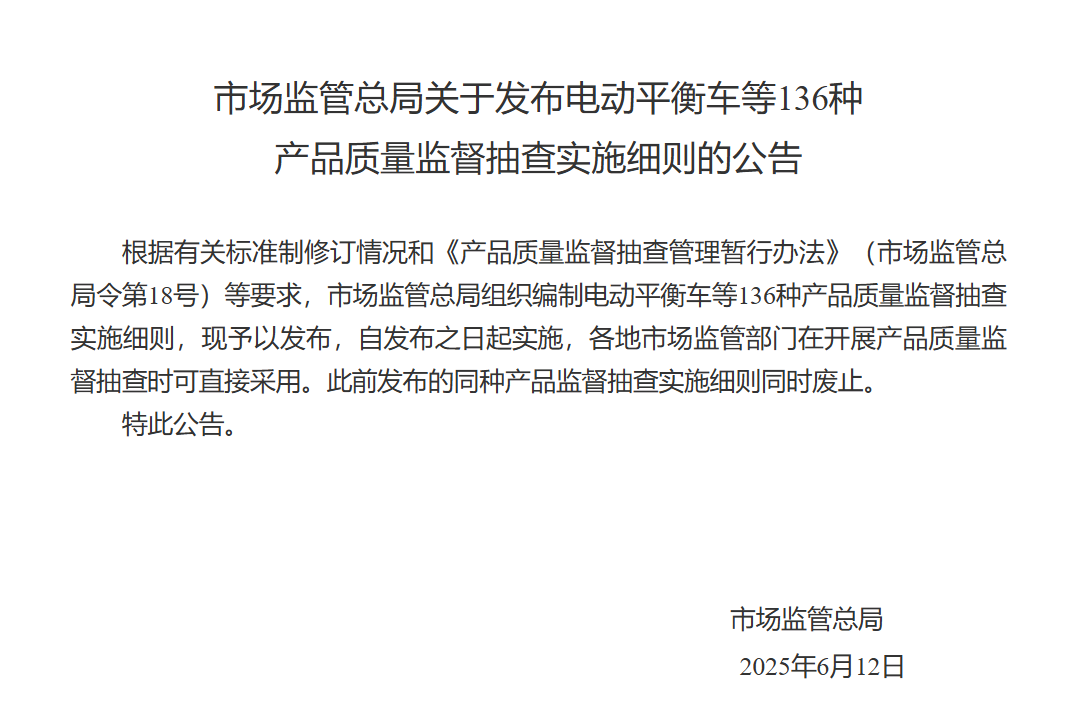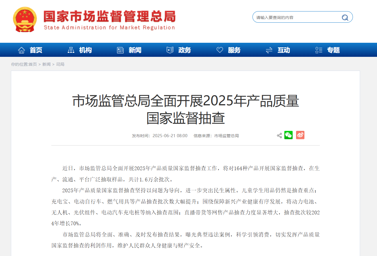 近日,市場監(jiān)管總局全面開展2025年產(chǎn)品質(zhì)量國家監(jiān)督抽查工作,將對164種產(chǎn)品開展國家監(jiān)督抽查,在生產(chǎn)、流通、平臺廣泛抽取樣品,共計1.6萬余批次。市場監(jiān)管總局將全面、準確、及時發(fā)布抽查結果,曝光典型違法案例,科學引領消費,切實發(fā)揮產(chǎn)品質(zhì)量國家監(jiān)督抽查的利劍作用,維護人民群眾人身健康與財產(chǎn)安全。