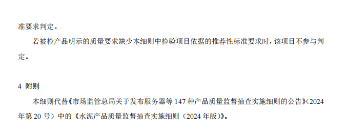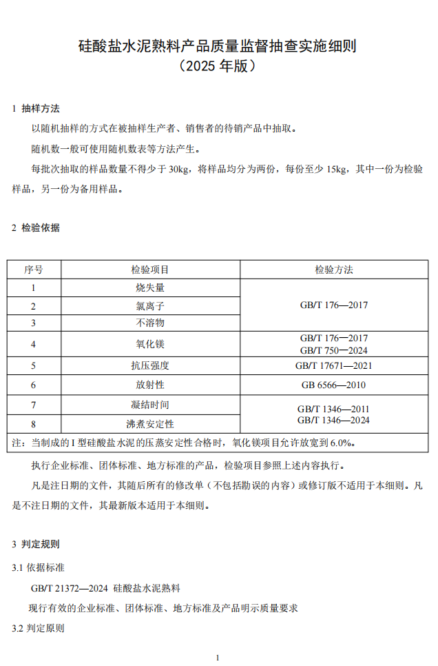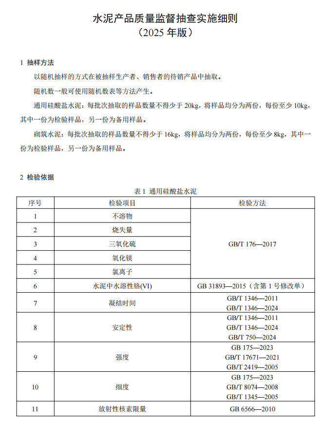 水泥人網(wǎng)注意到,市場監(jiān)管總局同期發(fā)布的還有水泥及熟料產(chǎn)品2025版產(chǎn)品質(zhì)量監(jiān)督抽查實施細則公告,并表示自發(fā)布之日起實施,各地市場監(jiān)管部門在開展產(chǎn)品質(zhì)量監(jiān)督抽查時可直接采用。此前發(fā)布的同種產(chǎn)品監(jiān)督抽查實施細則同時廢止。