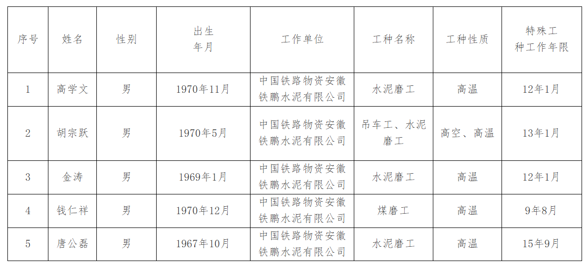 日前,安徽省人力資源和社會(huì)保障廳發(fā)布《中國(guó)鐵路物資安徽鐵鵬水泥有限公司2025年特殊工種提前退休人員公示》。水泥人網(wǎng)注意到,提前退休人員名單中包含中國(guó)鐵路物資安徽鐵鵬水泥有限公司5名職工,其工種涉及水泥磨工、吊車工及煤磨工竺產(chǎn),工種性質(zhì)分別涉及高溫和高空。特殊工種工作年限從9年8月至15年9月不等。詳情如下: