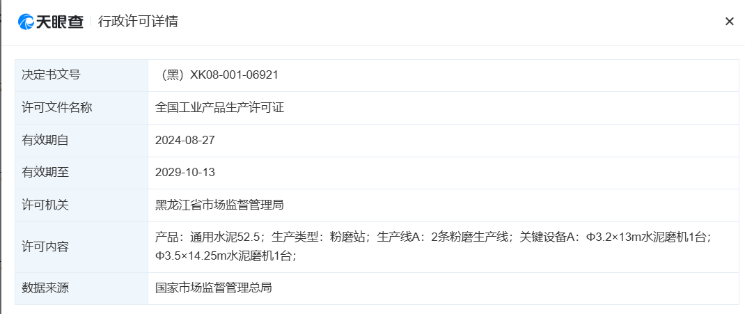 根據(jù)工信部公開信息顯示,雞西賽龍水泥制造有限公司2019年10月14日辦的生產(chǎn)許可證中許可類型為粉磨站,關(guān)鍵設(shè)備為Φ3.2×13m水泥磨機1臺;Φ3.5×14.25m水泥磨機1臺。在許可內(nèi)容之內(nèi)并沒有關(guān)于水泥熟料生產(chǎn)線。