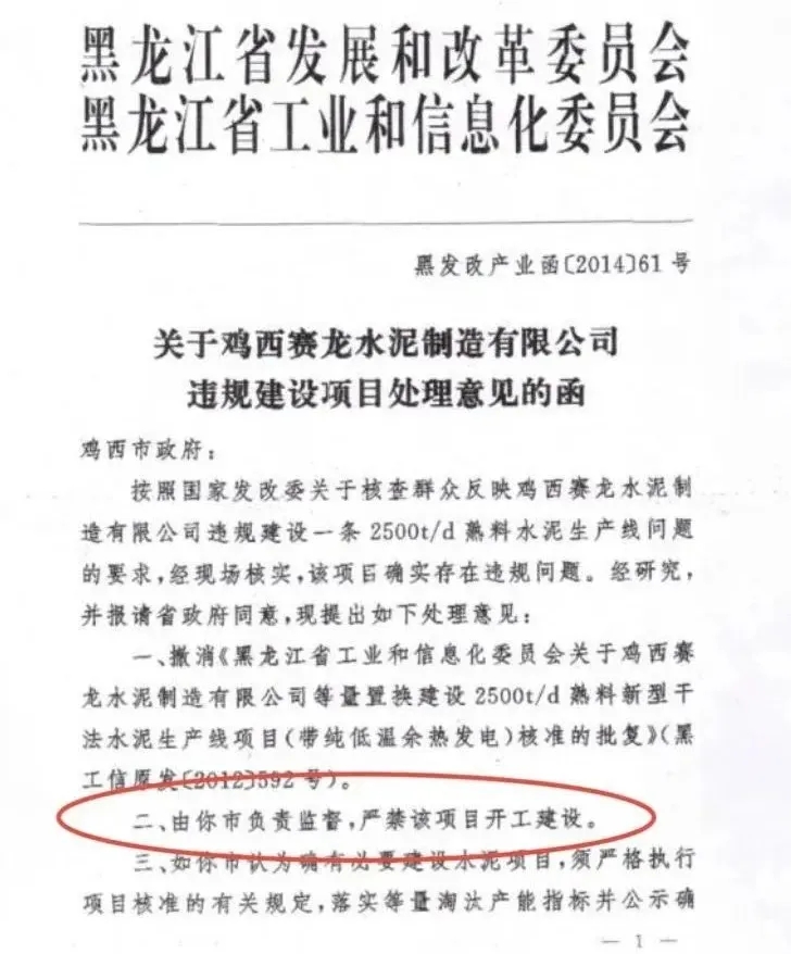 早在十年前,雞西賽龍水泥制造有限公司在建的日產(chǎn)2500噸水泥生產(chǎn)線,按照國發(fā)〔2013〕41號要求,嚴禁建設(shè)新增產(chǎn)能項目,分類妥善處理在建違規(guī)項目,清理整頓建成違規(guī)產(chǎn)能相關(guān)要求,被黑龍江省發(fā)改委、黑龍江省工信廳撤銷,并明確表示,嚴禁該項目開工建設(shè)。