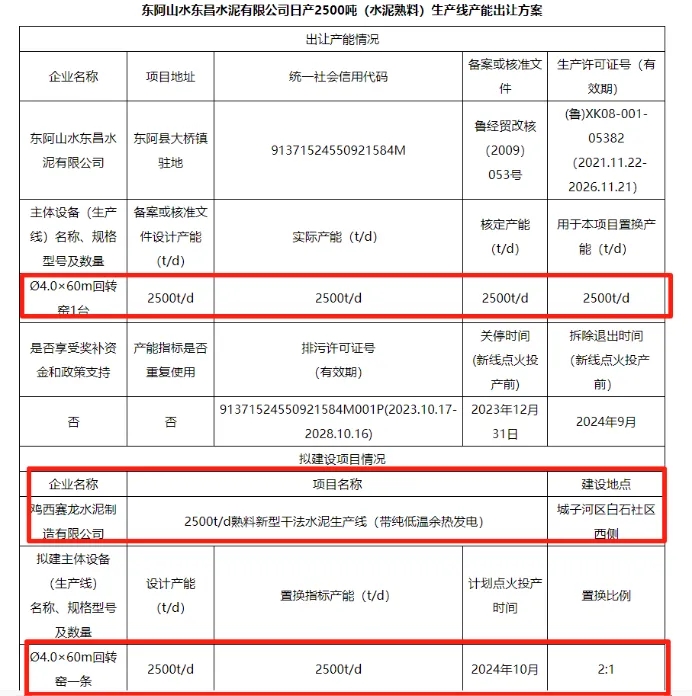 而在2024年7月24日,根據(jù)山東省工信廳發(fā)布的《東阿山水東昌水泥有限公司產(chǎn)能出讓轉(zhuǎn)移方案公告》,東阿山水東昌水泥有限公司將1條2500t/d的水泥熟料生產(chǎn)線指標置換給雞西賽龍水泥制造有限公司,建設(shè)一條Ø4.0×60m回轉(zhuǎn)窯。