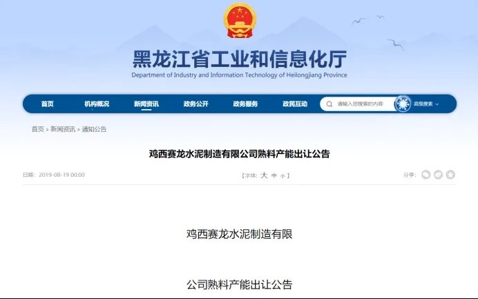 而在此之前,2019年8月19日,黑龍江省工業(yè)和信息化廳發(fā)布的《雞西賽龍水泥制造有限公司熟料產(chǎn)能出讓公告》顯示,雞西賽龍水泥制造有限公司出讓30萬噸/年新型干法回轉(zhuǎn)窯2.8*40m2臺給雞西賽龍水泥制造有限公司建設(shè)2500t/d熟料新型干法水泥生產(chǎn)線項目。