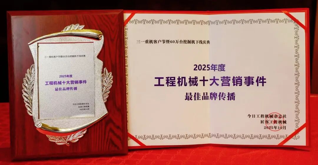 2025年10月22日,“2025年度工程機(jī)械十大營(yíng)銷(xiāo)事件”在江蘇常州重磅發(fā)布。“三一重機(jī)客戶節(jié)暨60萬(wàn)臺(tái)挖掘機(jī)下線慶典”榮登“2025年度工程機(jī)械最佳品牌傳播事件”。