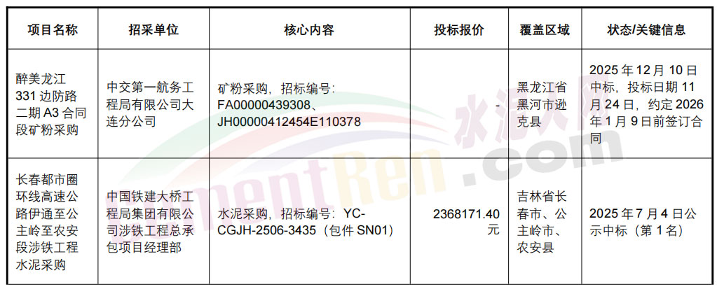 盡管存在質(zhì)量隱患,四平佳潤的產(chǎn)品仍成功打入東北重大工程供應(yīng)鏈,銷售網(wǎng)絡(luò)覆蓋吉林、黑龍江核心區(qū)域。招投標(biāo)信息顯示,2025年11月,企業(yè)憑借“大連分-醉美龍江331項目-公開招標(biāo)-礦粉”項目中標(biāo),約定于2026年1月9日前與中交第一航務(wù)工程局有限公司簽訂合同,供貨至黑龍江省黑河市遜克縣醉美龍江331項目部,該項目為邊防路重點工程,對建材質(zhì)量有嚴(yán)格要求。